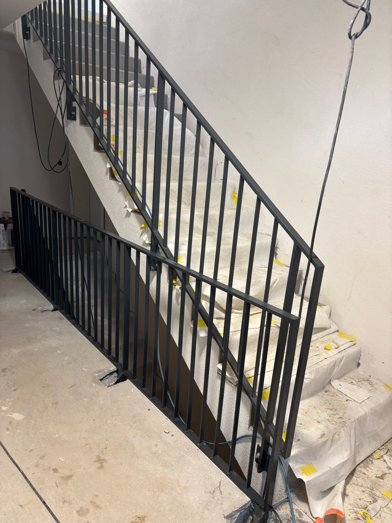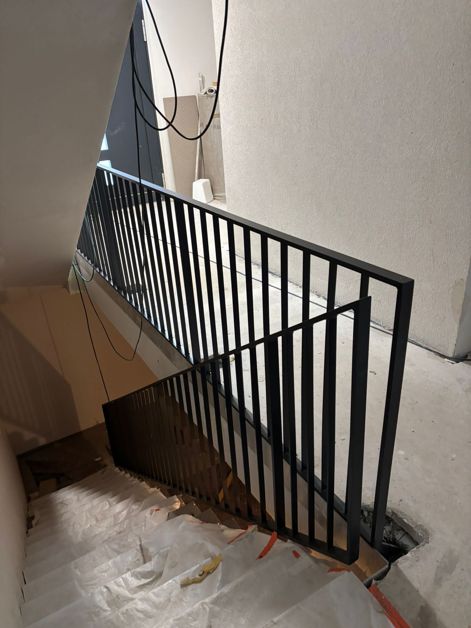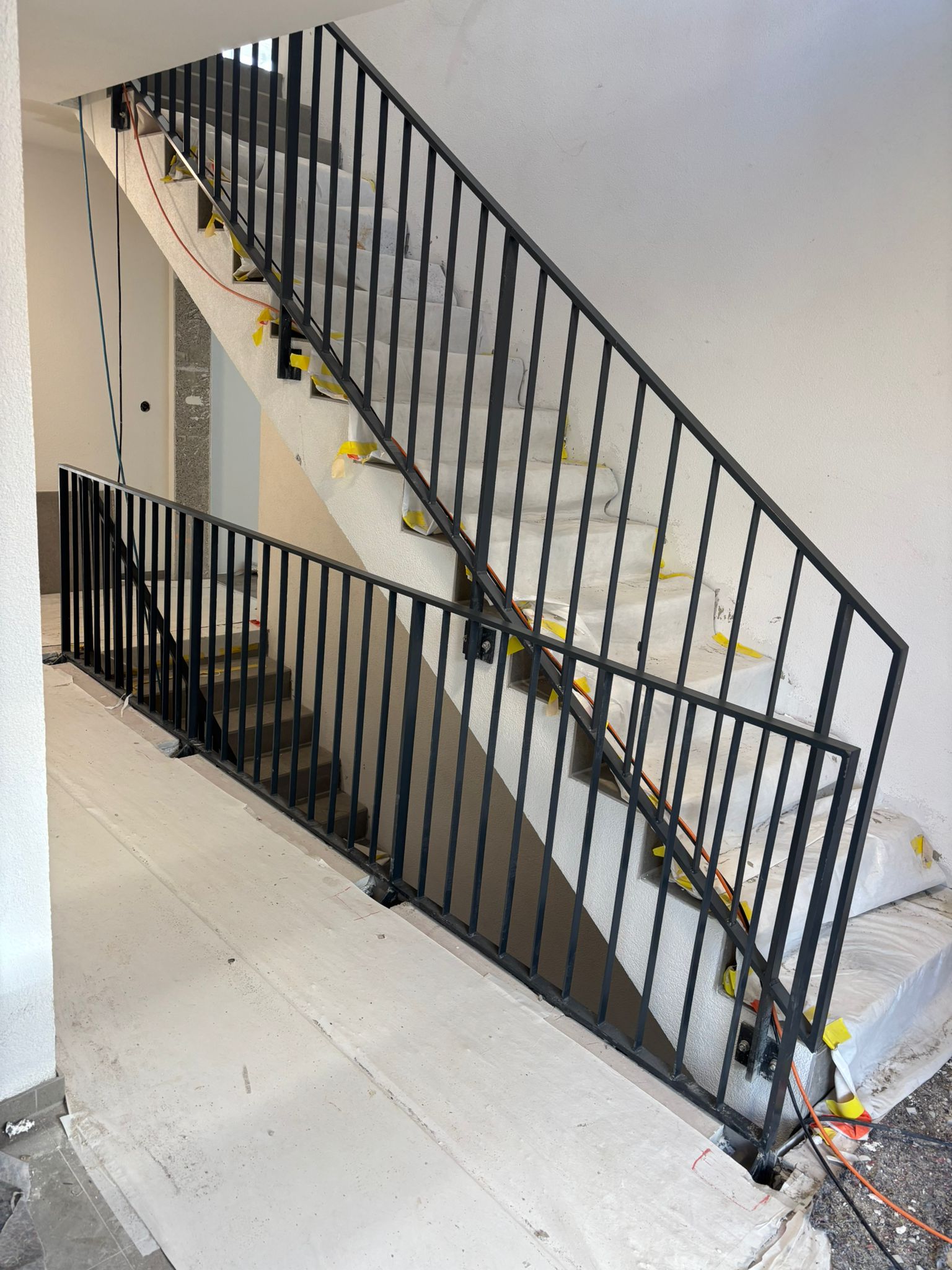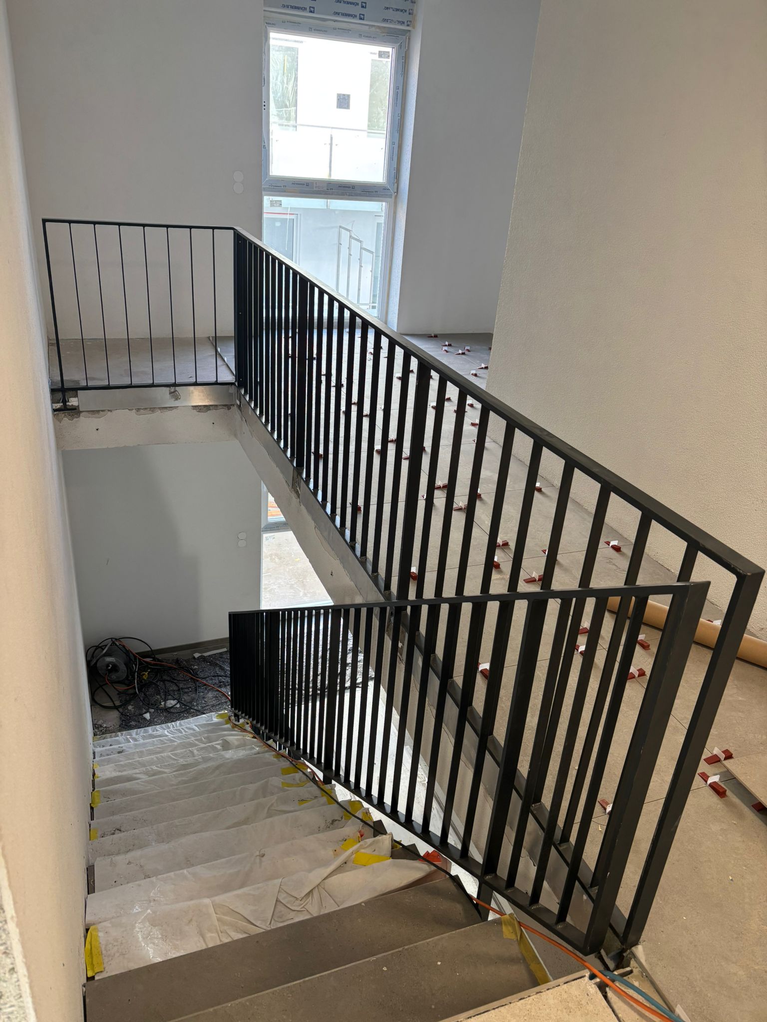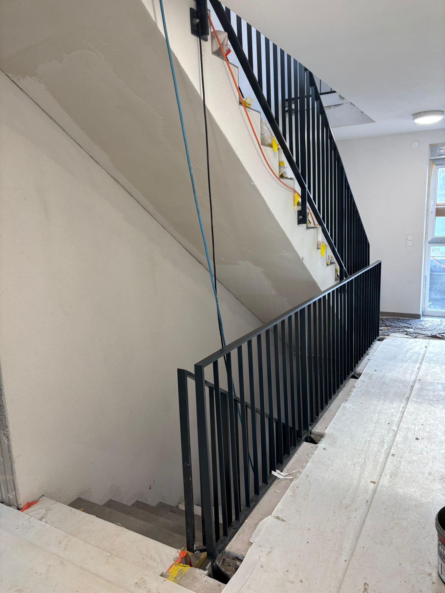 Montage eines Innentreppengeländers in einem Mehrfamilienhaus in Dornstetten. Dort wurde es auf eine halbgewendelte Treppe angepasst, grundiert und in hellgrau beschichtet.