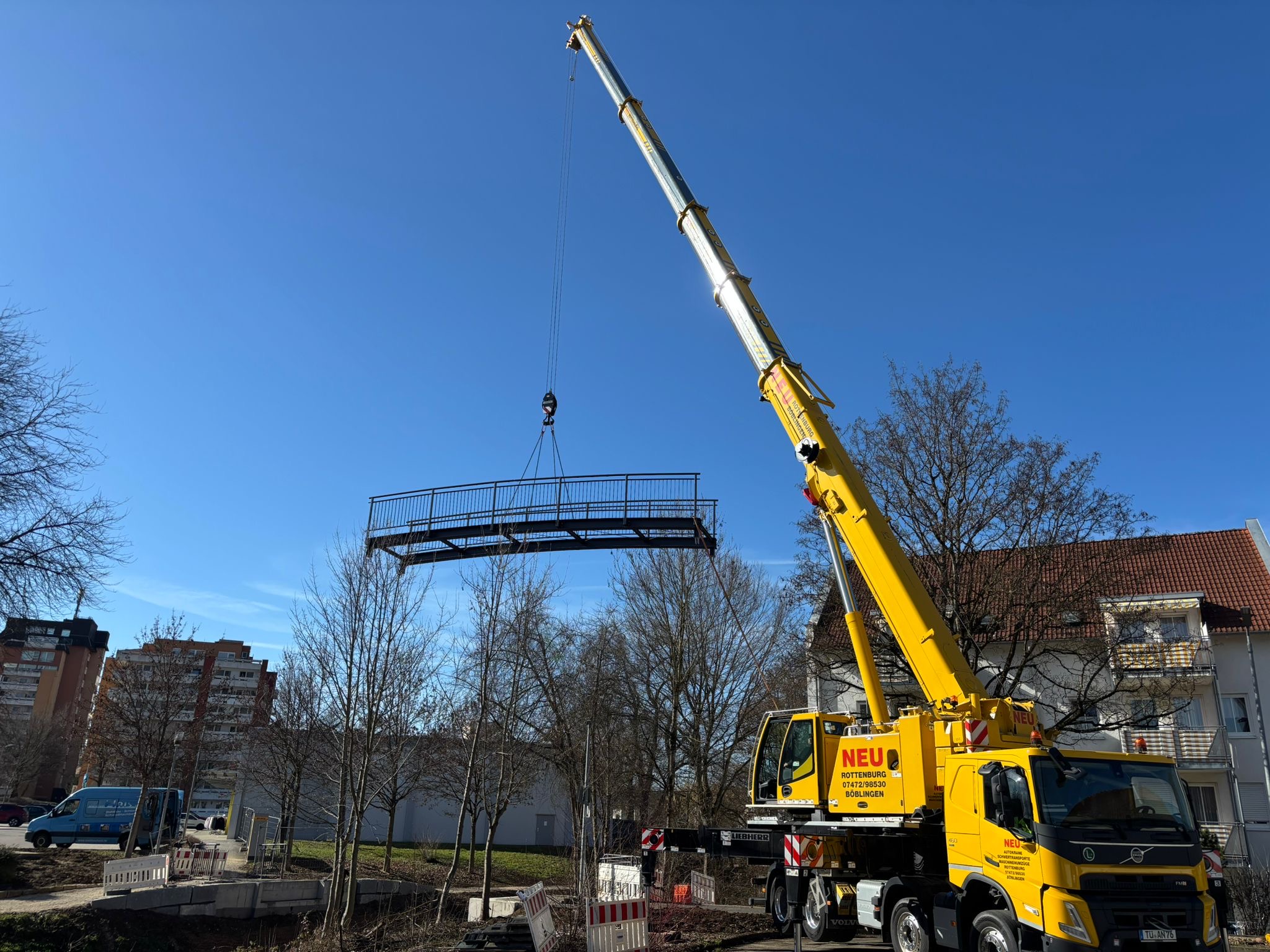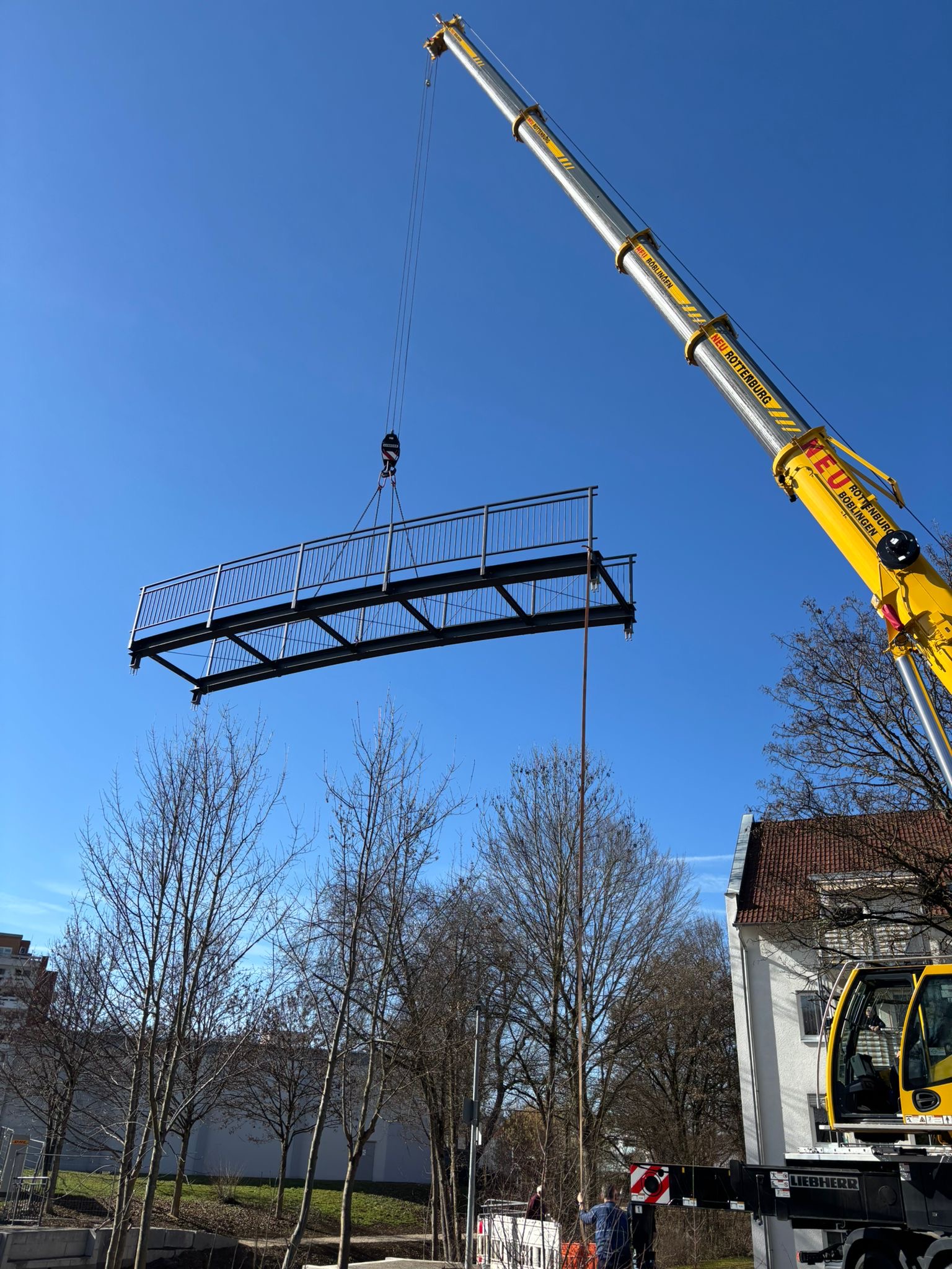 Montage einer feuerverzinkten Fluchttreppe für das Arbeitsamt Rottweil, welche 16 Meter hoch und 9 Tonnen schwer ist. Auch Absturzgeländer wurden beim Arbeitsamt montiert.